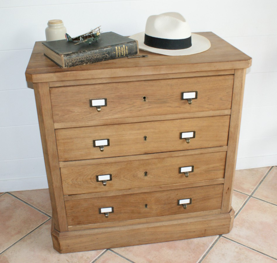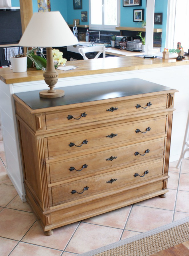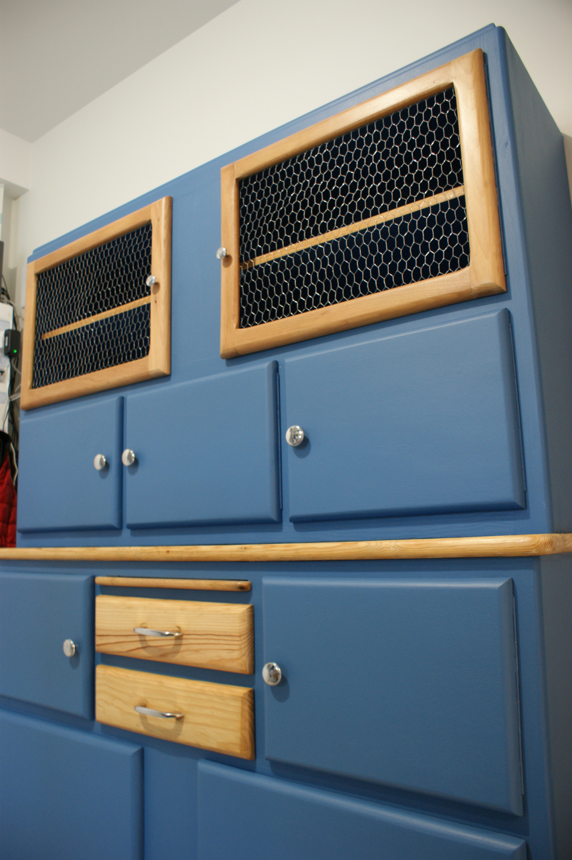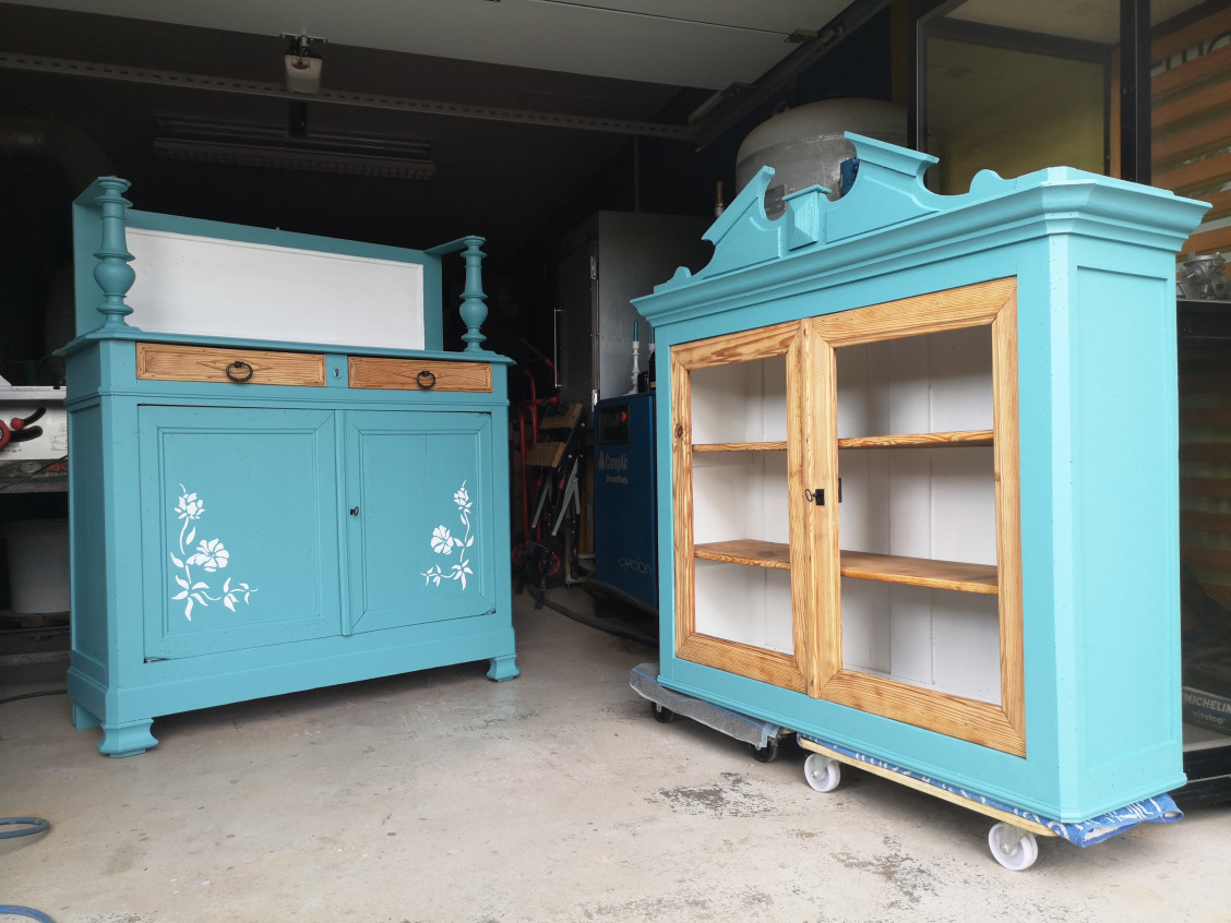 Peinture coloris bleu satin, motif floral, tiroirs et portes vitrées en pin naturel vernis