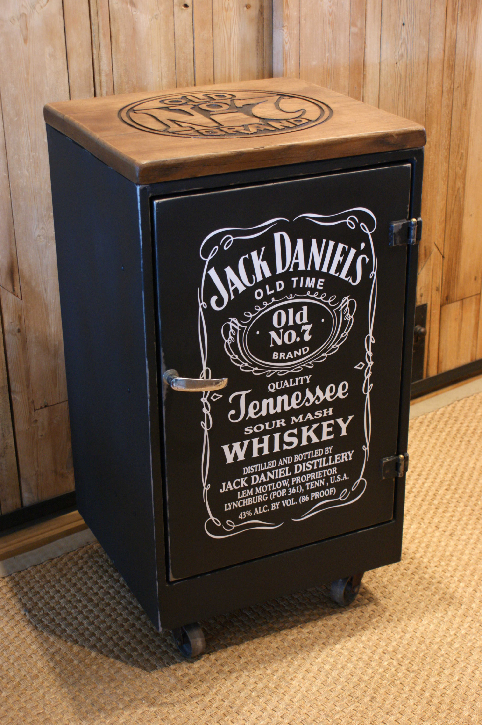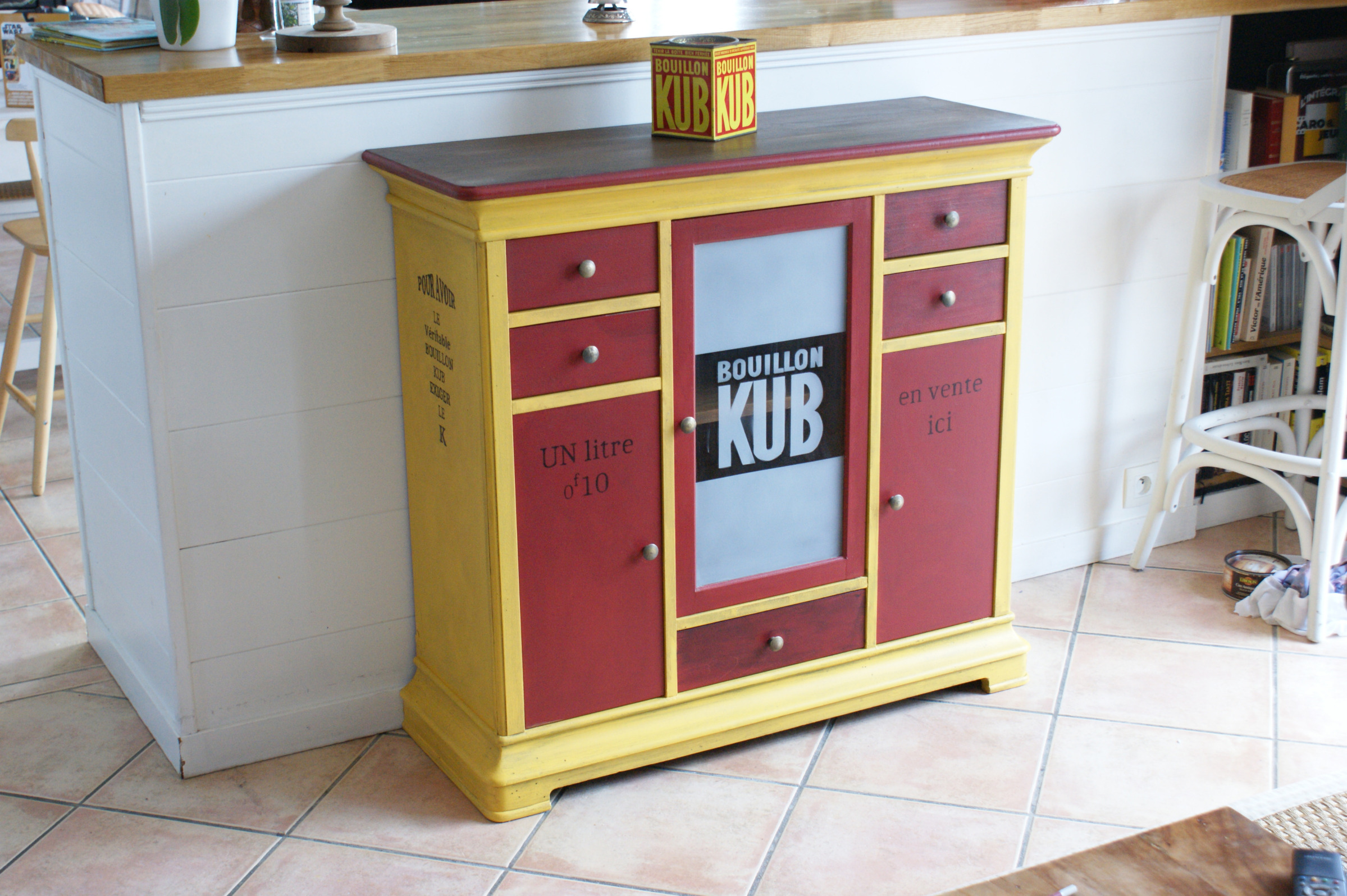 Petit buffet transformé en meuble à épices sur le thème de la marque KUB. Vitre gravée